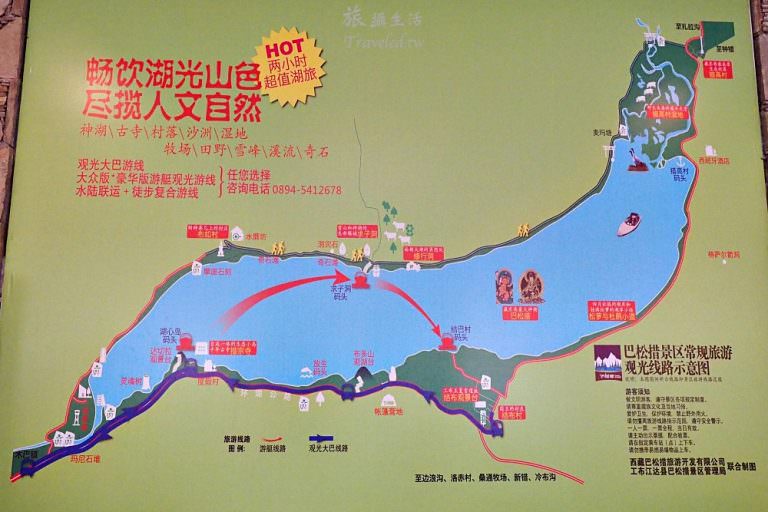 參觀的方向是遵行順時針方向繞一圈也是與佛教信仰有關,湖心島就位於半月形巴松措的肚臍位置上,相傳這座島是空心島,島的面積不大但是上頭有供奉蓮花生大師的措宗寺、桃樹與松樹交纏的連理樹,充滿宗教色彩的千年青岡樹,繞上一圈也要花個一小時,一邊步行一邊聽著導遊的解說,不但第一次體驗了轉經輪的方式、也入境隨俗的以雙手合空掌朝拜蓮花生大師,雙掌空心表示接受佛法薰陶,朝拜後攤開掌心朝上代表接受萬物生靈,寺中有各種寶石也與磁場強化有關。